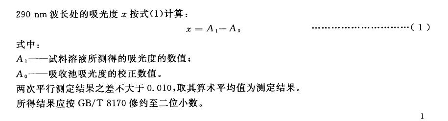 稱取50.0 g 實驗室樣品,精確至0.1 g ,置于250 mL 燒杯中,加入50 mL 水攪拌溶解,并靜置至氣泡消失。將溶液注入一個石英吸收池中,將水加入另一個石英吸收池,在290 nm 波長處,以水作參比,用紫外分光光度計測量吸光度。