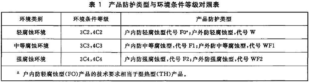 3.5 產品的防護類型劃分以化學活性物質條件(C) 為基礎,按環境條件的嚴酷程度等級相應對照形成產品的防護類型,其關系如表l 所示。